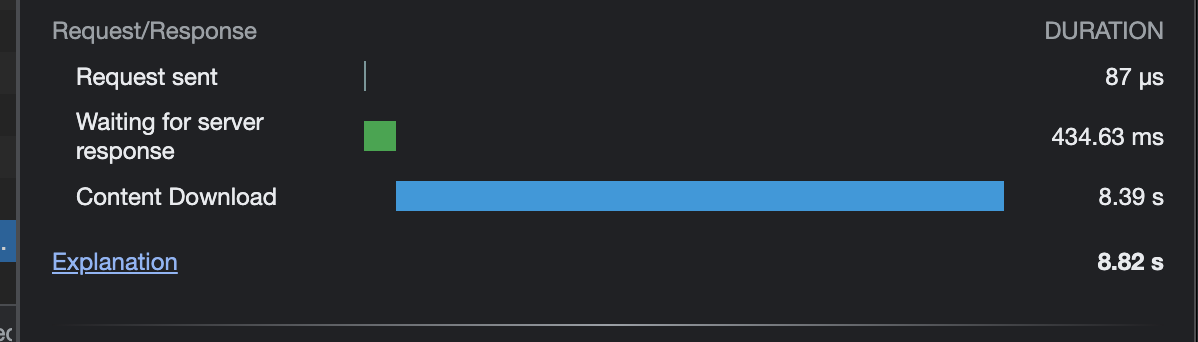 용량이 높은 이미지인 경우 브라우저에서 이를 받아오는데 8초가 넘게 걸리는 경우도 있다는 것이다. 다음 포스팅에서는 이를 최적화하는 과정을 써보도록 하겠다!