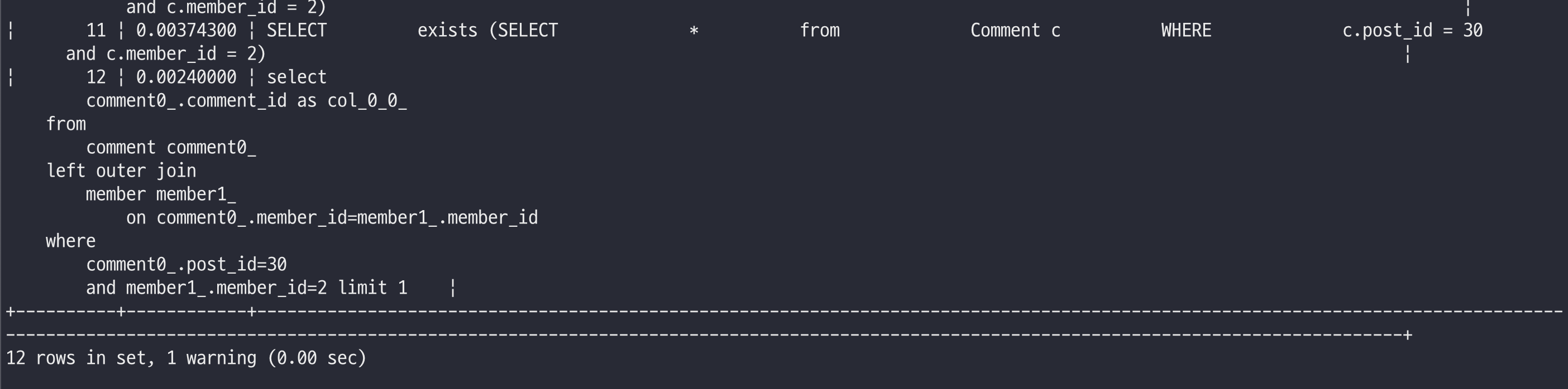 이를 개선하기 위해서 native sql 의 exists 쿼리를 사용하려 하려는 순간… existsByPostAndMemberId 의 경우 left outer join이 일어나지만, limit이 걸려있어 outer join 전체적으로 일어나기 전에 일치하는 post_id 를 찾으면 탐색을 멈출것 같은데? 라는 생각이 들었다. 궁금하니 바로 수행 시간을 알아보자.